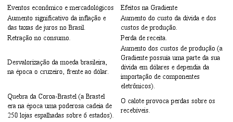 No início do terceiro período estratégico, “turbulência e diversificação”, ocorreram três eventos importantes na economia brasileira, após o Choque do Petróleo, em 1979 (Quadro 3) que também contribuíram para o endividamento da Gradiente.