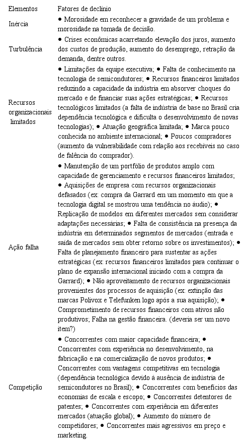 Em suma, a análise anterior permite identificar dois fatores de declínio: (1) a falta de sensibilidade da empresa em reconhecer e antecipar as pressões internas e externas que podem ameaçar a sobrevivência a longo prazo (Weitzel e Jonsson (1989); (2) a substancial redução na base de recursos da organização durante um período de tempo.