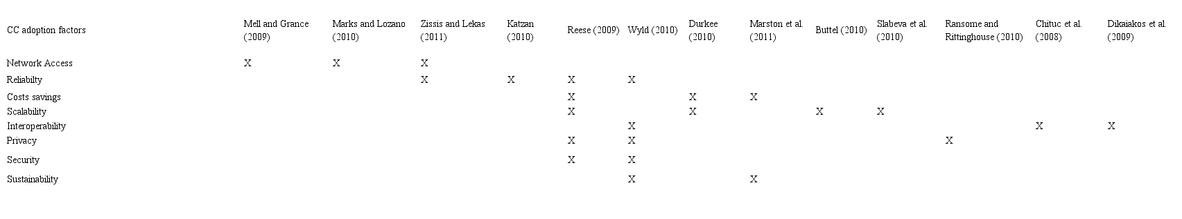 The factors considered relevant for the adoption of CC were network access, security and privacy.
