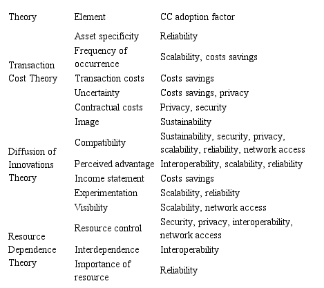 The CC adoption factors are supported by the following theories: Transaction Cost Theory (Alchian and Demsetz, 1972; Fianni, 2002; Grove and Malhotra, 2003; Furubotn and Richter, 2000; Liu et al., 2008; Liang and Huang, 1998; Williamson, 1975; Simon, 1947), Diffusion of Innovations Theory (Moore and Benbasat, 1991; Rogers, 1995), and Resource Dependency Theory (Pfeffer and Salancick, 1978). The relationship between the factors and the theories is detailed in Sobragi (2012). Chart 2 shows the associations identified between the theories and the CC adoption factors.