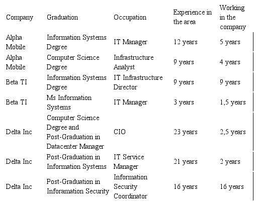 In exploratory studies, the unit of analysis assists in defining the limits of the theory (Dubé and Paré, 2003). In this study, it is composed of organizations that have adopted CC in non-sporadic activities and in which different areas of the organization participate in the process. The research protocol was developed based on a literature review and validated via email by three experts. In order to obtain a comprehensive analysis of the script, a heterogeneous range of experts was contacted, including an academic, the owner of a CC services supply company and a user of the technology. Once the protocol was validated, the three cases were selected based on convenience according to the following requirements. The organization must: (i) have already adopted some type of CC; (ii) use technology non-sporadic way and in different areas of the organization; (iii) provide access to professionals who participated in the adoption of the technology and can explain the reasons for the adoption; besides, (iv) the cases must include organizations that use public clouds and private clouds, given that the adoption factors may be different for each cloud type. The interview script, which was prepared based on the factors relevant for CC adoption identified in the literature (presented in Chart 2), is presented in Appendix A. Seven professionals whose profiles corresponded to those contained in item (iii) (Chart 3) responded to the survey. For reasons of confidentiality, the organizations participating in the survey requested their names be kept confidential, and so they have been assigned fictitious names.