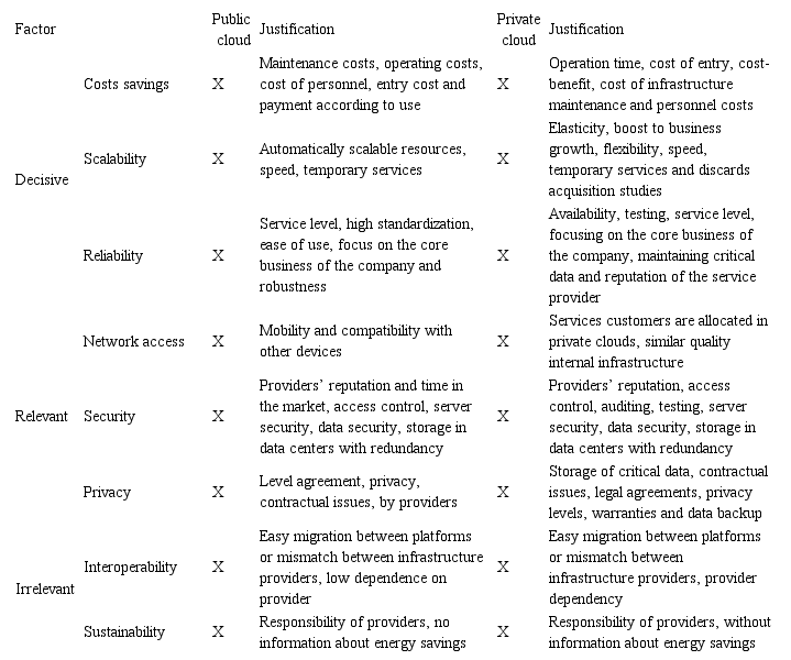 The factors reliability, scalability and costs savings were considered decisive for the adoption of cloud computing in all the studied cases. Security and privacy were analyzed by the respondents in the CC adoption process, but to a lesser degree. The factors interoperability and network access were only considered in isolated cases and, therefore, require further confirmation to be included as factors in CC adoption. Sustainability was not considered in the adoption of cloud computing in any of the cases studied.