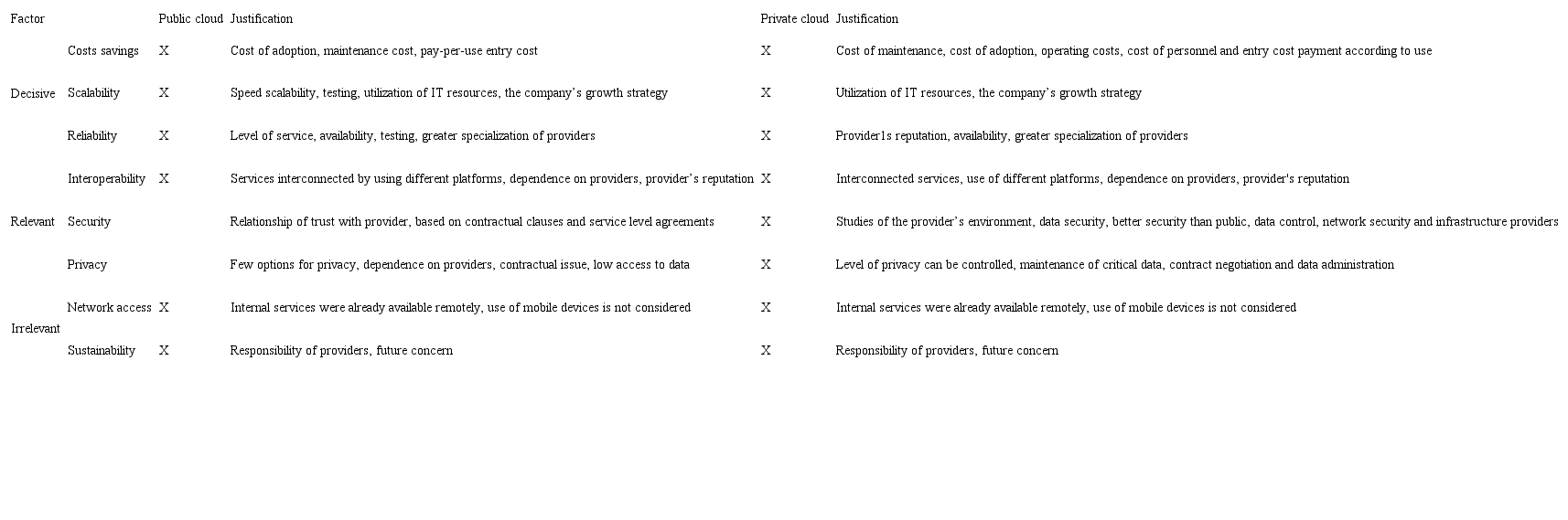 Chart 5 summarizes the CC adoption factors at Beta IT. It is noteworthy that in this company a different attitude was identified regarding the factor of security in the comparison between the public and private clouds.