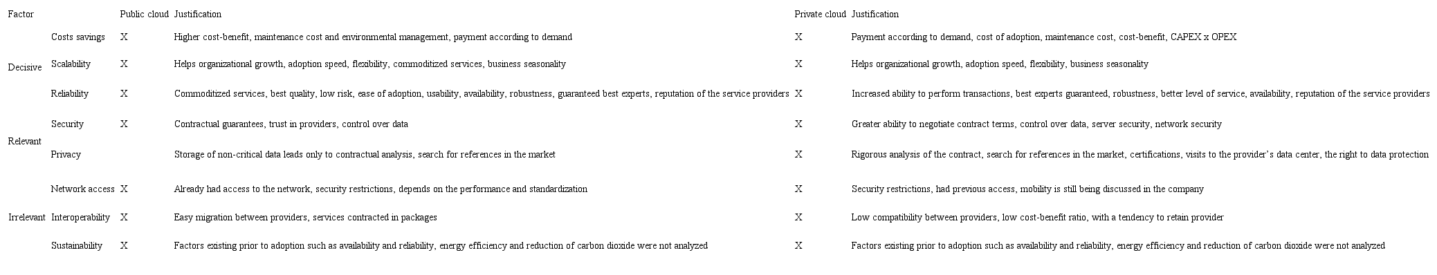 The data sources for the research project are the face-to-face, semi-structured interviews and consultations on corporate websites, as well as reports associated with the adoption of CC in the studied organizations. The content analysis technique was used in the data analysis. For Bardin (1977), content analysis is a set of techniques for the analysis of communication, which aims, through objective measures and a systematic description of the messages, to obtain indicators that allow the inference of knowledge. The data analysis was conducted with the aid of MAXQDA 10 software. To better understand the importance of each factor in the adoption of cloud computing, the factors were categorized as being decisive, relevant or indifferent. The decisive factors are essential for the adoption of the technology. The relevant factors have some importance in the adoption of cloud computing, although they are not necessary for the adoption of the technology. The irrelevant factors are those that the organizations do not judge to be important for the adoption of the technology.