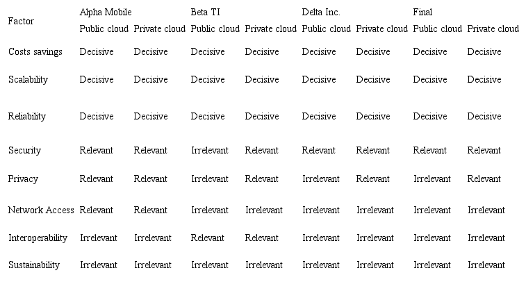 For Alpha Mobile, the factors considered decisive in the adoption of cloud computing, both in the public and private clouds, were cost savings, scalability and reliability.
