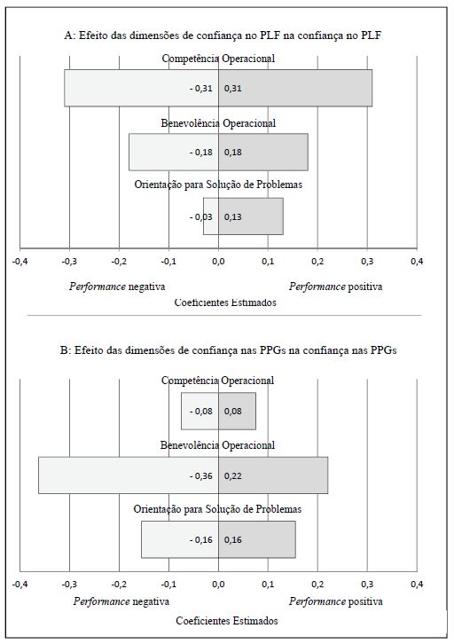 Um maior padrão de efeitos assimétricos é percebido nas dimensões de confiança nas PPGs, conforme a Figura 2 (parte B). A competência operacional das PPGs apresentou tanto efeitos de higiene, como efeitos motivadores (βCom_Ope_PPG = 0,08) não ocorrendo variações de desempenhos nos domínios negativos e positivos. Do mesmo modo, a orientação para solução de problemas das PPGs também apresentou invariabilidade nos domínios de desempenhos positivos e negativos (βOri_Sol_Pro_PLF = 0,16), comportando-se diferente do resultado obtido na faceta da confiança no PLF. Contudo, um claro e convincente padrão assimétrico é percebido na variável da benevolência operacional. Percepções de comportamentos benevolentes nas PPGs apresentaram um efeito de negatividade (βBen_Ope_PPG = - 0,36), impactando significativamente na exaustão da confiança. Em contrapartida, mudanças de unidades positivas apresentam um efeito menor, embora significativo (βBen_Ope_PPG = 0,22). Esse resultado suporta a sugestão de Sirdeshmukh et al. (2002), pois, ao se subestimar o interesse próprio em favor do interesse dos consumidores, pode-se ajudar na formação da confiança do consumidor.