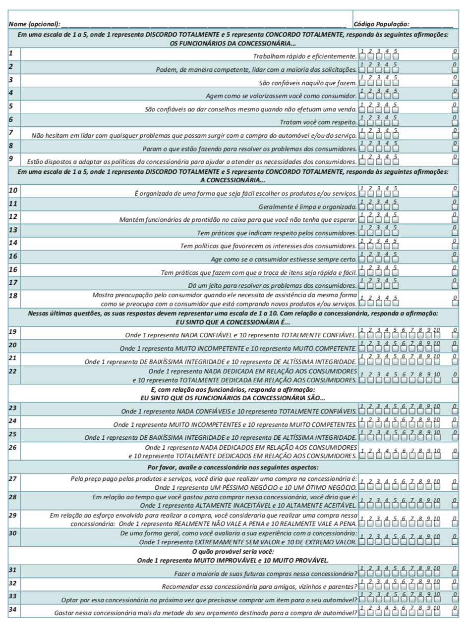 A elaboração do instrumento de pesquisa partiu da tradução para a língua portuguesa do questionário utilizado por Sirdeshmukh et al. (2002). Como as escalas de Sirdeshmukh et al. (2002) foram originalmente desenvolvidas para os setores de varejo de vestuário e viagens aéreas, foi necessário realizar uma adequação do conteúdo para o ambiente no qual a presente pesquisa foi aplicada, ou seja, o contexto de varejo e de serviços em uma concessionária de automóveis.