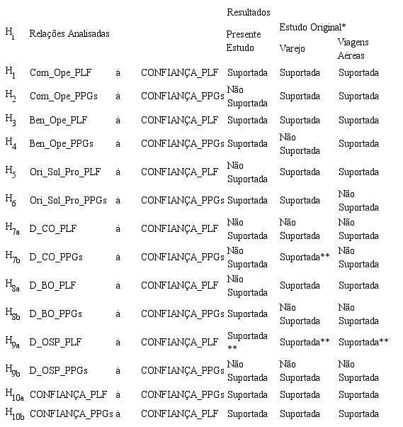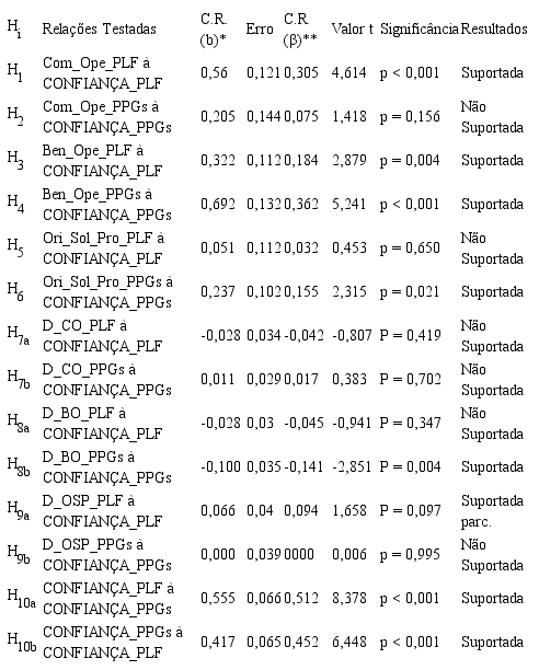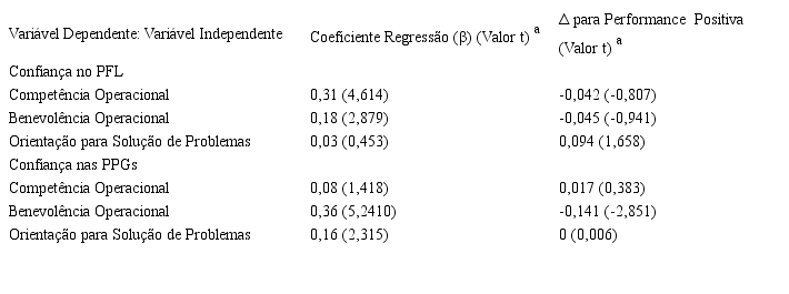 Em relação às hipóteses de assimetria das dimensões formadoras da confiança, a hipótese H8b obteve suporte estatístico, podendo ser suportada (β = - 0,141, p < 0,05). Consequentemente, H7a, H7b, H8a, H9a e H9b foram rejeitadas. Entretanto, tal como no estudo original, um efeito de fronteira foi obtido para H9a, confiança na Orientação para Solução de Problemas do PLF (β = 0,094, p < 0,10). Assim sendo, existe suporte parcial para H9a.