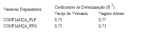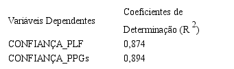 As hipóteses propostas foram testadas através da introdução de variável dummy[1] como termo na equação de regressão para cada variável dependente das facetas da Confiança (PLF e PPGs). Como decorrência das relações propostas e devido às múltiplas variáveis dependentes, o método analítico foi baseado na estimativa simultânea dos seguintes sistemas de equações: