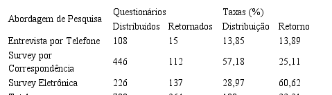 O processo de coleta de dados foi realizado pelo método de levantamento de campo (Malhotra, 2009) e transcorreu no período compreendido entre os meses de novembro e dezembro de 2009, a partir da combinação de três formas de pesquisa: (i) entrevista por telefone assistida por computador; (ii) survey por correspondência; e (iii) survey eletrônica (Cooper e Schindler, 2003; Hair Jr. et al., 2005; Remler e Van Ryzin, 2011). A Tabela 1 apresenta os dados de distribuição (encaminhamento) e de retorno dos questionários.