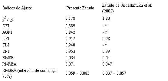 A fim de propor uma comparação com o estudo original, é apresentada a Tabela 7 com os índices de ajustes do modelo de Sirdeshmukh et al. (2002).
