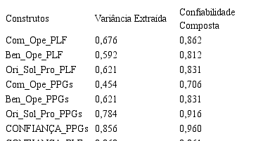 Para a avaliação da validade convergente, foram analisadas as cargas padronizadas (standardized loadings) de cada indicador no seu respectivo construto, a confiabilidade composta e a variância extraída (Hair Jr. et al., 2009; Fornell e Larcker, 1981). Todas as cargas fatoriais padronizadas excederam o valor mínimo exigido de 0,5 (os resultados variaram entre 0,51 e 0,94). Ressalta-se que, de 34 itens, apenas um apresentou carga de 0,51 e todos os demais ficaram acima de 0,66. Em relação à variância extraída, o construto Com_Ope_PPGs apresentou o valor de 0,454, estando, praticamente, ao nível de fronteira (cut-off) de 0,5, sugerido por Hair Jr. et al. (2009), sendo que os demais construtos tiveram seus respectivos valores superiores ao exigido. No caso da confiabilidade composta dos construtos, todos eles apresentaram índices superiores ao recomendado na literatura. Para facilitar tal compreensão, a Tabela 4 apresenta os resultados da validade convergente com as análises dos construtos do modelo de mensuração.