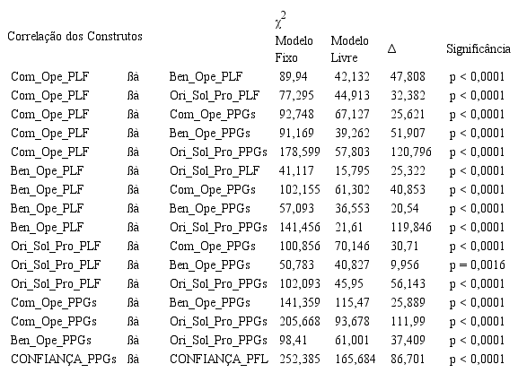 Para a confirmação da validade discriminante, optou-se pelo método sugerido por Bagozzi e Phillips (1982), que avalia a diferença entre os χ2 de um par de construtos, sendo criados, para tanto, dois modelos. Os resultados das análises desse método estão representados na Tabela 5. Percebe-se, ao se analisar as ∆χ2, através desse teste, que todos os construtos considerados no estudo, tanto no submodelo quanto no modelo de mensuração, possuem conceitos diferentes, pois há diferenças significativas ao nível de p < 0,005.