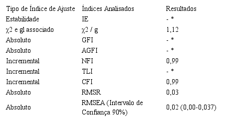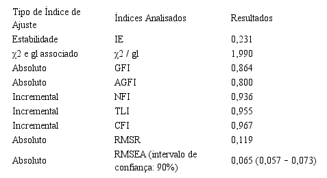 Atendendo aos procedimentos teóricos recomendados, vários índices de ajuste foram utilizados para se avaliar a qualidade de encaixe do modelo testado. Seguindo alguns pressupostos, os índices de ajuste devem ser empregados para avaliar a qualidade de encaixe de um modelo e devem incluir: (i) o valor do qui quadrado (χ2) e os graus de liberdade (gl) associados (Hair Jr. et al., 2009; Arbuckle, 2009; Hu e Bentler, 1995; Wheaton et al., 1977); (ii) pelo menos um índice de ajuste absoluto, dentre os seguintes índices: GFI (Goodness-of-fit Index ou Índice de Qualidade de Ajuste), AGFI (Adjusted Goodness-of-fit Index ou Índice Ajustado de Qualidade de Ajuste), RMSEA (Root Mean Square Error of Approximation ou Raiz do Erro Quadrático Médio de Aproximação) e RMSR (Root Mean Square Residual ou Raiz Padronizada do Erro Médio) (Tabachnick e Fidell, 2013; Arbuckle, 2009; Hair Jr. et al., 2005; Kline, 2011); (iii) pelo menos um índice incremental, dentre os seguintes índices: CFI (Comparative Fit Index ou Índice de Ajuste Comparativo) (Hair Jr. et al., 2009; Kline, 2011), TLI (Tucker-Lewis Index ou Índice de Tucker-Lewis) (Hair Jr. et al., 2009) e NFI (Normed Fit Index ou Índice de Ajuste Normado) (Hu e Bentler, 1995; Hair Jr. et al., 2009); e (iv) pelo menos um índice de má qualidade de ajuste: idem para RMSEA. Aqui, cabe a Ressalva de que esse índice pode ser apresentado também como um índice de ajuste absoluto. Assim, o índice RMSEA é tanto um índice de má qualidade de ajuste, quanto um índice de ajuste absoluto.