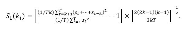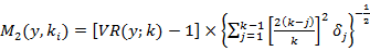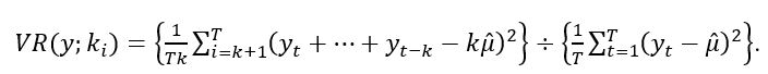 A dificuldade de interpretação dos testes M1e M2 é que os resultados podem ser conflitantes para diversos valores de k. Visando contornar essa questão, Chow e Denning (1993) propuseram o quociente de variâncias múltiplas (multiple variance ratio test). Tal teste implica, segundo seus autores, uma modificação do teste de Lo e MacKinlay (1988), onde é possível verificar, ao mesmo tempo, se todos os quocientes de variância são iguais a 1. Esse teste, segundo Hoque et al. (2007), baseia-se na ideia de que a decisão com relação à hipótese nula pode ser baseada no valor máximo absoluto das estatísticas de quociente de variâncias individuais. O teste de Chow e Denning (1993) é apresentado na formulação (5).
