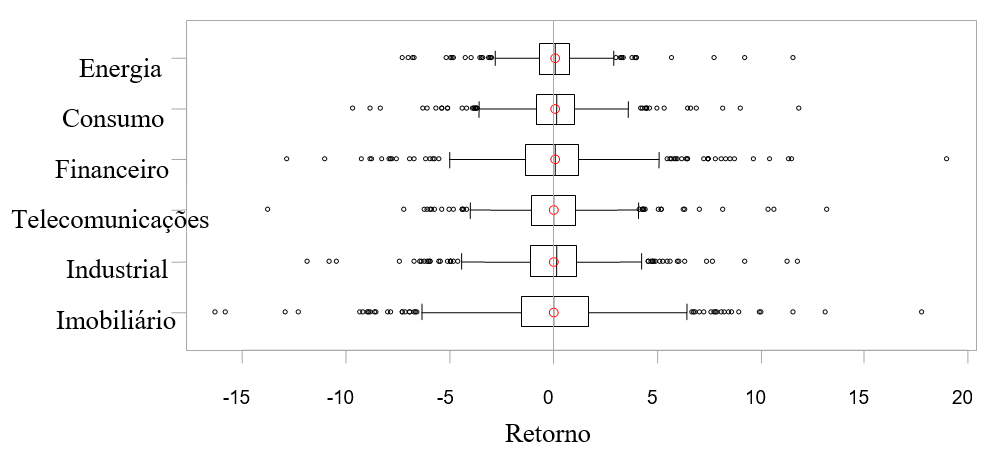 É possível verificar, com base nos resultados da Tabela 1, que o índice setorial com o maior retorno médio no período estudado é o de Energia Elétrica. Entretanto, tomando como base a mediana, o índice com maior rentabilidade média é o Industrial. Não obstante, o setor Imobiliário obteve os maiores valores para variância e, por consequência, desvio-padrão. Ainda com base nas estatísticas descritivas da Tabela 1, verifica-se que os log-retornos dos índices setoriais possuem assimetria positiva para todos os índices, exceto para o setor industrial, e curtose plactocúrtica. Esse padrão dos retornos dos índices setoriais é exposto visualmente por meio dos gráficos box-plot, exibidos na Figura 1. Os gráficos box-plot presentes na Figura 1 evidenciam assimetria e curtose dos retornos. Também é pertinente verificar a presença de observações atípicas (outliers).