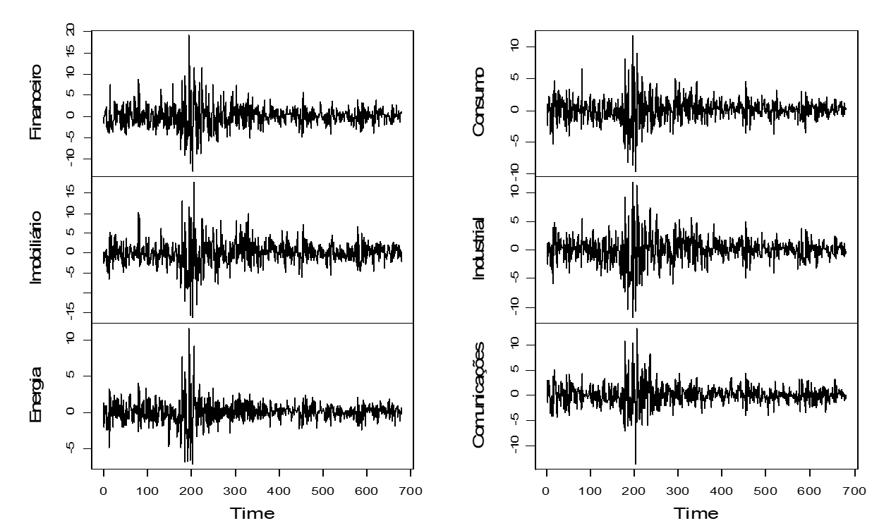 Através da Figura 2, é possível visualizar que houve relativa estabilidade na evolução temporal dos log-retornos dos índices setoriais, exceto para o período equivalente ao segundo semestre de 2008, quando há certa turbulência. Tal acontecimento pode ser explicado pela crise financeira de 2008, que assolou os mercados mundiais, não fazendo do Brasil uma exceção.
