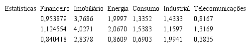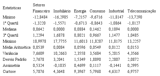 Com base no nível diário em pontos dos índices setoriais da BM&F/Bovespa, foram calculados os log-retornos. Em seguida, foram calculadas as estatísticas descritivas desses retornos. Os resultados obtidos para essa primeira análise são expostos na Tabela 1.