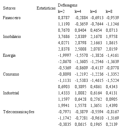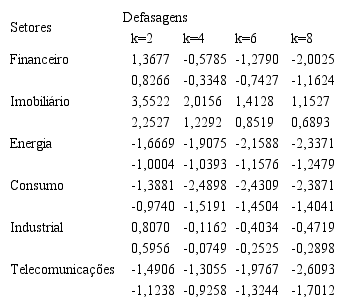 Brevemente, cabe comentar que os resultados obtidos permitem concluir que existe um padrão entre os setores, que é a rejeição da hipótese de caminho aleatório nos testes que consideram defasagens isoladas e não rejeição dos testes que consideram as defasagens conjuntamente. Entretanto, o setor imobiliário rejeita a hipótese de caminho aleatório em todos os tipos de teste, revelando que houve oportunidade de arbitragem.
