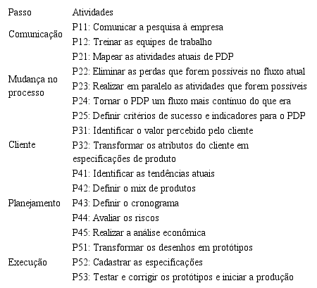 O segundo passo, mudança no processo, consistiu em cinco atividades: mapeamento das atividades atuais de PDP; eliminar as perdas que fossem possíveis no fluxo atual; realizar em paralelo as atividades que fossem possíveis; tornar o PDP um fluxo mais contínuo; e definir critérios de sucesso e indicadores para o PDP.