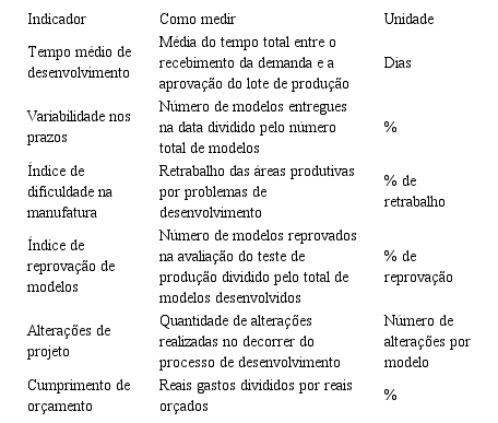 Por fim, foram definidos fatores de sucesso do PDP. Os fatores foram escolhidos com base nos objetivos de pesquisa, que foram a redução do tempo de desenvolvimento, sem outros impactos na manufatura: reduzir tempo de chegada ao mercado; reduzir a dificuldade na manufatura; e atingir objetivos de qualidade, custo e escopo. Esses fatores foram traduzidos em indicadores que capturam e mensuram o atingimento dos fatores de sucesso: chegada ao mercado (dois primeiros indicadores), manufatura (terceiro), atingir objetivos de qualidade (quarto), escopo (quinto), e custo-alvo do produto final (último indicador). Os indicadores são apresentados no Quadro 3.