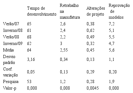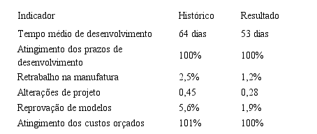 Os indicadores relativos à qualidade também apresentaram melhoria. Os retrabalhos na manufatura caíram próximo à metade, devido principalmente à participação mais direta e à responsabilidade atribuída à equipe de manufatura durante os procedimentos de teste. As alterações nos modelos durante o desenvolvimento apresentaram queda de quase 40%, principalmente, pela aproximação física entre as atividades e a melhor comunicação dentro da equipe. Já as reprovações de testes de produção tiveram redução em quase três vezes, fruto da melhoria na especificação e da aproximação com as áreas produtivas. Os indicadores de prazos e custos orçados permaneceram praticamente inalterados. Sintetizando, a pesquisa apresentou resultados positivos em quatro dos seis indicadores destacados para medir o desempenho do processo. Dois mantiveram-se inalterados.