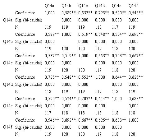 Todos os coeficientes são positivos e significativos, indicando a presença de correlação significativa entre as variáveis representadas pelos quesitos q14a (parcela do orçamento que estou/estive envolvido na elaboração), q14b (a quantidade de fundamentação fornecida a mim por um superior hierárquico quando o orçamento é/era revisado), q14c (a frequência de discussões com superiores relacionadas ao orçamento iniciadas por mim), q14d (a quantidade de influência que eu sinto/senti que tenho/tinha sobre o orçamento final), q14e (a importância da minha contribuição para o orçamento) e q14f (a frequência de discussões relacionadas ao orçamento iniciadas pelo meu superior quando os orçamentos estão/estavam sendo definidos).