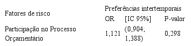 No que se refere à covariável “participação no processo orçamentário”, foi possível observar que os resultados obtidos por meio da regressão logística não apontaram associação significativa entre a participação no processo orçamentário e preferências intertemporais dos respondentes quando da elaboração do orçamento, não corroborando os pressupostos definidos no referencial teórico de que a participação no processo orçamentário pode reduzir distorções ocasionadas por vieses cognitivos, tais como vieses capazes de conduzir ao fenômeno da folga orçamentária.