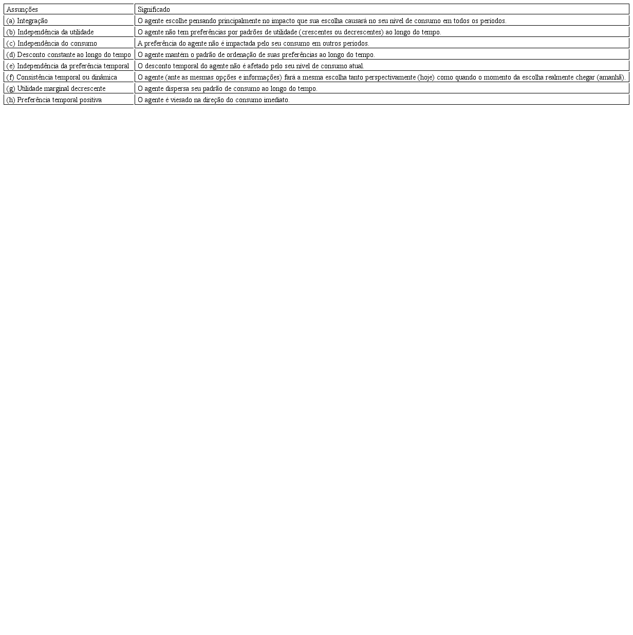 A Economia Clássica desenvolveu o modelo de utilidade descontada, MUDC, com vistas a representar o complexo processo de escolhas intertemporais (Samuelson, 1937; Aguiar, 2011). Segundo esse modelo, as pessoas apresentam padrões de comportamento condizentes com a possível maximização do somatório de utilidade descontadas. Muramatsu e Fonseca (2009) apresentam o Quadro 1 que permite entender como se comportam os indivíduos em escolhas intertemporais segundo o MUDC.