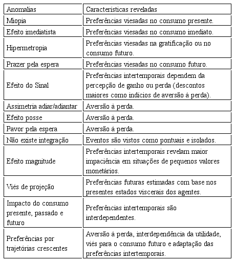 Esse modelo se desgastou por ser incompleto frente à complexidade do processo decisório tal qual ocorre na subjetividade dos indivíduos. Diversas anomalias oriundas desse modelo incentivaram reflexões sobre o poder preditivo e explanatório de proposições dessa natureza. Conforme o Quadro 2, apresentado por Muramatsu e Fonseca (2009), as anomalias do modelo de utilidade descontada constante refletem a incompletude dos modelos explanatório da economia positiva.