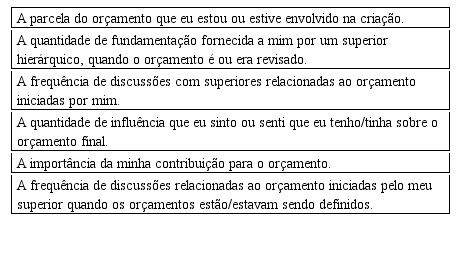 Uma escala para captar o construto “participação no processo orçamentário” foi igualmente proposta. O construto participação no processo orçamentário interessa ao presente estudo pelo fato de essa variável ser apontada por diversos trabalhos como de central importância para uma adequada alocação de recursos com vistas ao atingimento dos objetivos organizacionais (Nouri e Parker, 1996; Junqueira et al., 2010). Utilizou-se o instrumento de seis itens de Milani (1975), já testado e amplamente utilizado em outros estudos internacionais e que apresentou consistência interna elevada, conforme justificam Nouri e Parker (1996), que usaram o instrumento para avaliar o envolvimento do entrevistado e a sua influência sobre o processo orçamentário. A escala de resposta utilizada foi a de Likert com sete pontos, variando de um (nenhuma) a sete (total). Os seis itens da escala foram traduzidos para a língua portuguesa sem alterações significativas no seu conteúdo, conforme descreve o Quadro 3.