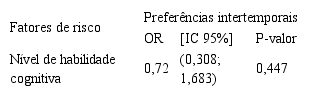 Na regressão logística, por questões operacionais, foram agrupados os indivíduos que não acertaram nenhuma questão no grupo dos portadores de um “baixo nível de habilidade cognitiva” e os demais indivíduos (que acertaram uma, duas ou três questões) no grupo dos portadores de um “maior nível de habilidade cognitiva”.