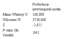 Por meio dos testes de Wilcoxon e Mann-Whitney (Tabela 2), foi possível verificar que a diferença entre os grupos é significativa (p-valor < 0,05) em termos de comportamento em preferências intertemporais, considerando-se as médias das respostas apresentadas pelos respondentes.