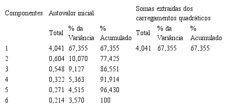 A análise de componentes principais, apresentados na Tabela 3, indica a existência de um único autovalor. Esse único autovalor (4,041) certifica a unidimensionalidade do constructo participação no processo orçamentário.