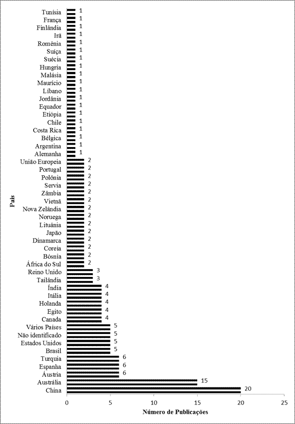 Foi identificada como relevante a participação de países emergentes, em especial a China, que tem reagido plenamente às demandas mundiais. Foi constatado, durante a realização deste trabalho, que a China é um dos países com maior publicação sobre CP. Esse fato é também notado nos países desenvolvidos que foram destacados neste estudo, a exemplo da Austrália, segundo país com maior número de publicações em CP, demonstrando a aplicação dos conceitos e práticas da CP. Cabe ressaltar a situação contraditória desses dois países, considerando-se o panorama industrial atual, com atividades de alto impacto ambiental em relação ao número de publicações no tema CP. Na Austrália, essas publicações também têm como assunto a atividade de mineração, que exige grandes quantidades de energia e produtos químicos, produz resíduos de grande volume e emissões de elementos tóxicos para a quantificação do ciclo de vida da indústria de processamento de minerais. Em contrapartida, na China, o assunto das publicações é relativo a melhores práticas de aplicação da Produção mais Limpa e à mudança de tecnologia que pode ser explicada pela estratégia chinesa de proteção ambiental que, desde 1900, iniciou uma transição gradual da prática de end-of-pipe para a prevenção da poluição.