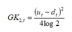 Seguindo esta mesma linha de Parkinson (1980), Garman e Klass (1980) chegaram a um estimador ainda mais eficiente usando não apenas as cotações de máximo e mínimo, mas também de abertura e fechamento: