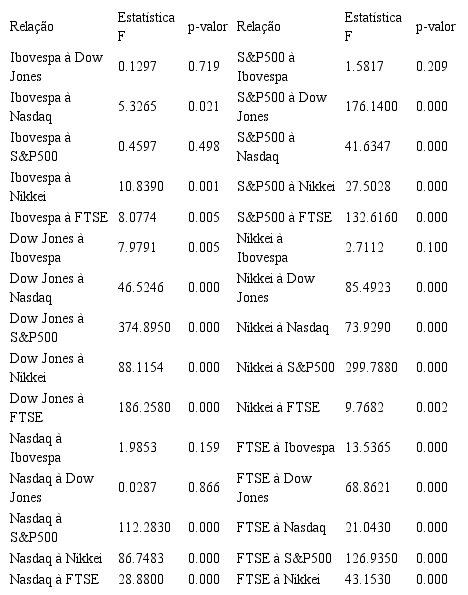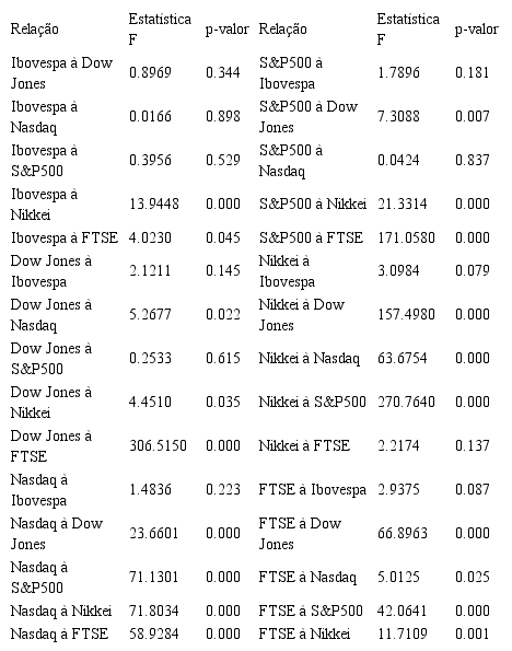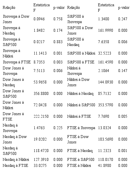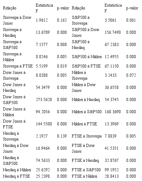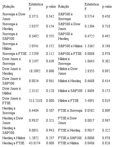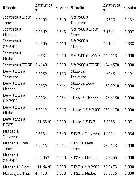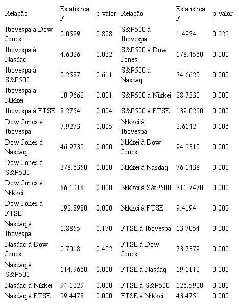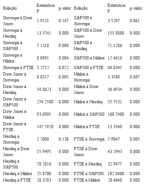De forma geral, foi possível observar que a maioria dos mercados analisados apresenta o fenômeno da causalidade bidirecional no sentido de Granger entre seus índices. Esse resultado era esperado pelo que estabelecem as teorias macroeconômica e financeira, visto que, em se tratando de mercados globais, compostos por investidores de diferentes regiões do mundo, oscilações provindas de um mercado específico devem mesmo gerar incertezas sobre as expectativas quanto ao comportamento dos preços em outros mercados. Essa dinâmica afeta as volatilidades dos preços dos seus ativos.