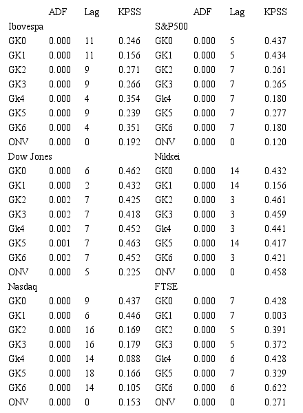 Para avaliar a ordem de integração, a Tabela 2 expressa os resultados dos testes de raiz unitária de Dickey-Fuller e KPSS aplicados às séries de volatilidades em nível de Garman-Klass e overnight dos diferentes mercados mundiais.