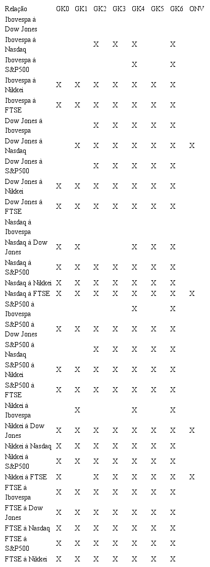 A Tabela 3 apresenta uma súmula dos resultados dos testes de causalidade entre as volatilidades dos índices das bolsas internacionais. Os blocos marcados com um X indicam a rejeição da hipótese nula de ausência de causalidade ao nível de significância de 10%, enquanto que os blocos em branco indicam a aceitação da hipótese. Assim, os blocos marcados indicam a existência da relação de interdependência entre os mercados, de acordo com uma estimativa de volatilidade específica.