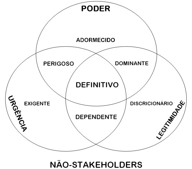 Por fim, tem-se a última zona, representada pela interseção dos três círculos da Figura 1, onde se encontram os stakeholders definitivos. O fato de possuírem os três atributos confere-lhes destaque especial, sendo, por conseguinte, facilmente reconhecidos pelos gestores. Além disso, em virtude da capacidade de exercerem grande influência sobre as atividades da empresa, os stakeholders definitivos devem receber um tratamento prioritário quanto ao atendimento de suas expectativas.