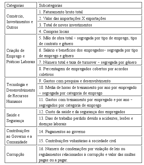 Para melhor visualização e compreensão da análise de dados, o Quadro 2 apresenta os seis grupos de indicadores (nesse estudo, intitulados “categorias de análise”) e os 16 indicadores de Responsabilidade Social Corporativa (nesse estudo, intitulados “subcategorias de análise”), cuja divulgação é recomendada pela ONU.