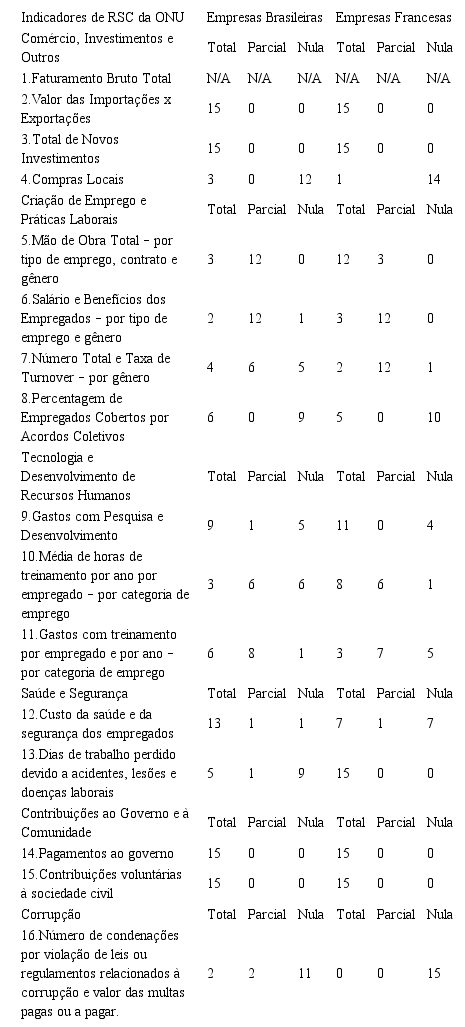 A Tabela 1 apresenta a consolidação dos dados da pesquisa e fornece uma visão geral da divulgação dos 15 indicadores de Responsabilidade Social Corporativa recomendados pelo Guia da ONU, cujos conteúdos foram pesquisados nos documentos das empresas francesas e brasileiras que fizeram parte do estudo. É necessário destacar que o indicador valor das importações versus exportações não se qualificou como objeto de estudo dessa pesquisa em virtude de sua inaplicabilidade em relação às instituições financeiras que estão significativamente representadas na amostra, uma vez que, das 30 empresas pesquisadas, existem 7 bancos e uma companhia de seguros. Portanto, de 16, cai para 15 a quantidade de indicadores pesquisados.