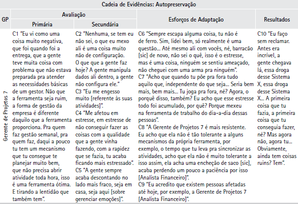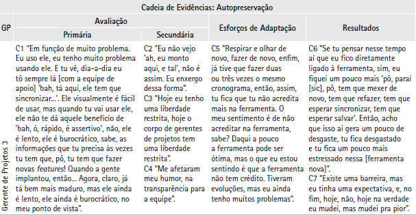 ESTRATÉGIA DE AUTOPRESERVAÇÃO: Os relatos dos Gerentes de Projetos 2, 3 e 7 ilustraram essa sequência, visto que perceberam a mudança de sistema como uma ameaça (Figura 7, C1, Figura 8, C1 e Figura 9, C1), possuíam baixo controle do contexto (Figura 7, C2, C3, C4, Figura 8, C2, C3, C4, C5 e Figura 9, C2, C3, C4), realizaram esforços principalmente focados em emoções (Figura 7, C5, C6, Figura 8, C6, C7, C8, C9 e Figura 9, C5), obtiveram como retorno a minimização de efeitos negativos e a restauração de sua estabilidade emocional (Figura 7, C7, C8, C9, Figura 8, C10 e Figura 9, C6, C7) frente a impactos negativos que o sistema trouxe em sua performance.