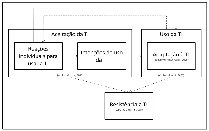 Os estudos de aceitação e uso, adaptação e resistência à TI possuem relacionamentos, embora abordem diferentes aspectos das reações dos usuários à TI. Conforme Venkatesh et al. (2003), as reações individuais para o uso da TI bem como as intenções de usar a TI (as quais são originadas a partir das reações individuais para usar a TI) irão balizar o uso da TI pelo indivíduo. Conforme Beaudry e Pinsonneault (2005), os processos de adaptação irão ocorrer quando os usuários usarem a TI, e a resistência é um comportamento que pode se originar durante a adaptação dos usuários. E, conforme Lapointe e Rivard (2005), as condições iniciais do indivíduo e do seu ambiente em contato com a TI (descrita como “objeto” no modelo dos autores) irão originar os comportamentos de resistência à TI. Assim sendo, consegue-se perceber três grandes etapas nas interações de usuários com a TI: aceitação da TI, a qual abrange as expectativas dos usuários quanto à nova TI e as influências sociais no seu ambiente; uso da TI, abrangendo o uso e os processos de adaptação à TI; e resistência à TI, sendo o resultado da interação dos processos de aceitação e uso da TI. A Figura 1 ilustra os relacionamentos entre a aceitação, o uso, a adaptação e a resistência à TI, conforme conceitos observados em Venkatesh et al. (2003), Beaudry e Pinsonneault (2005) e Lapointe e Rivard (2005).