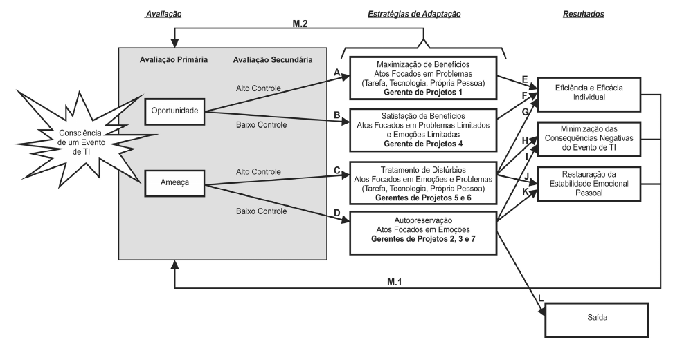 Beaudry e Pinsonneault (2005) afirmam que a estratégia de Maximização de Benefícios ocorre em cenários avaliados como uma oportunidade, em que os usuários possuem alto controle da situação. Nessa estratégia, os esforços serão focados em problemas e orientados a obter vantagem total das oportunidades e maximizar os benefícios pessoais. A estratégia de Satisfação de Benefícios ocorre em cenários avaliados como oportunidades, em que os usuários possuem baixo controle da situação. Nessa estratégia, ambos os tipos de esforços serão mínimos, visto que os usuários não podem fazer muito para explorar melhor a TI e seus benefícios (esforço para lidar com problemas), bem como os usuários não sentem a necessidade de reduzir tensões provindas do evento de TI (esforço para lidar com emoções). Conforme os autores, nessa situação, os usuários aproveitarão os benefícios da TI, que serão limitados, bem como terão pouco esforço de adaptação. A estratégia de Tratamento de Distúrbios ocorre em cenários avaliados como ameaças, em que os usuários possuem alto controle da situação. Nessa estratégia, ambos os tipos de esforços serão utilizados, o de lidar com problemas terá foco em gerenciar a situação, criando alternativas para o problema, e o de lidar com emoções terá foco em minimizar as consequências negativas esperadas e restaurar a estabilidade emocional. Por fim, a estratégia de Autopreservação ocorre em cenários avaliados como ameaças, em que os usuários possuem baixo controle da situação. Nessa estratégia, os esforços serão focados em emoções e orientados a restaurar a estabilidade emocional e reduzir as tensões provindas do evento de TI.