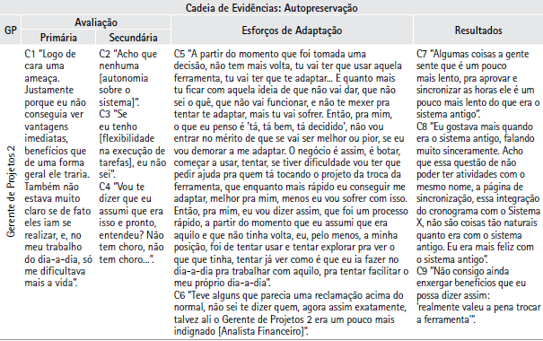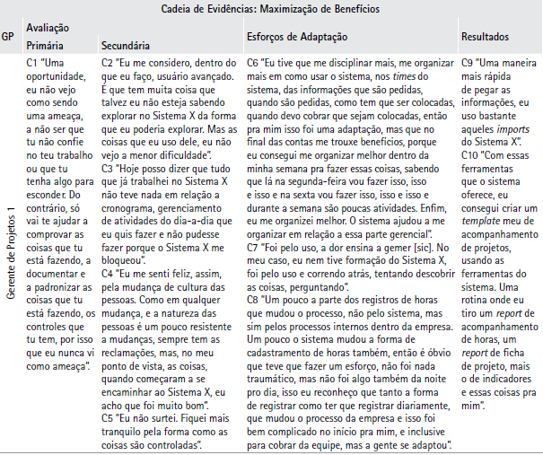 ESTRATÉGIA DE MAXIMIZAÇÃO DE BENEFÍCIOS: a estratégia pode ser observada no relato do Gerente de Projetos 1, que avaliou a mudança de sistema como uma oportunidade (Figura 3, C1), sentia-se com alto controle de suas emoções, do sistema e de suas atividades (Figura 3, C2, C3, C4 e C5), realizou esforços de adaptação focados em problemas (Figura 3, C6, C7, C8), obteve resultados positivos em sua eficiência e eficácia (Figura 3, C9 e C10), percebendo um ciclo de reavaliação positivo na organização, conforme citação abaixo:
