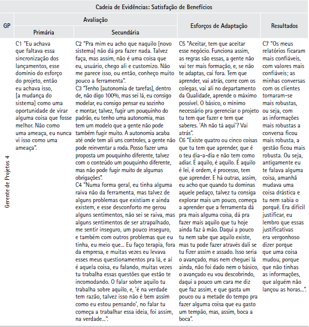ESTRATÉGIA DE SATISFAÇÃO DE BENEFÍCIOS: a estratégia pode ser observada no relato do Gerente de Projetos 4, que avaliou a troca de sistema como uma oportunidade (Figura 4, C1), possuía baixo controle do contexto (Figura 4, C2, C3 e C4), teve esforços limitados de adaptação focados em problemas e em emoções para manter suas atividades cotidianas e amenizar as dificuldades emocionais (Figura 4, C5 e C6), como resultados obteve aumento de eficácia (Figura 4, C7), e também entende que há um ciclo positivo de reavaliação na organização, conforme citação abaixo: