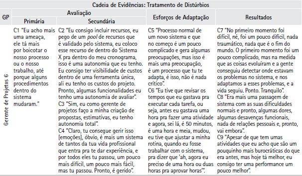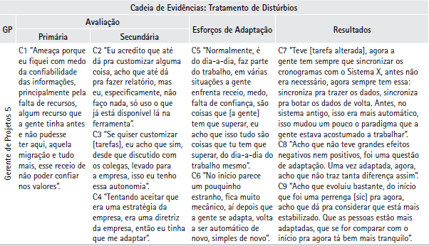 ESTRATÉGIA DE TRATAMENTO DE DISTÚRBIOS: essa estratégia pode ser observada nos relatos dos Gerentes de Projetos 5 e 6, pois eles avaliaram a troca de sistema como uma oportunidade (Figura 5, C1 e Figura 6, C1), possuíam alto controle sobre o contexto (Figura 5, C2, C3, C4 e Figura 6, C2, C3 e C4), exerceram uma estratégia de adaptação focando na resolução de problemas emocionais e de tarefas (Figura 5, C5, C6 e Figura 6, C5 e C6); quanto a resultados, o Gerente de Projetos 6 minimizou as consequências negativas do evento de TI (Figura 6, C7), restaurou sua estabilidade emocional (Figura 6, C8) e percebeu ganho de eficiência (Figura 6, C9), enquanto que a Gerente de Projetos 5 apenas minimizou os impactos da mudança de TI (Figura 5, C7) e restaurou a sua estabilidade emocional de maneira parcial, visto que ainda possui certa desconfiança do sistema (Figura 5, C8), não tendo percebido ganhos de eficiência e/ou eficácia; e ambos demonstraram perceber uma melhoria no uso do sistema na organização (Figura 5, C9 e Figura 6, C7).