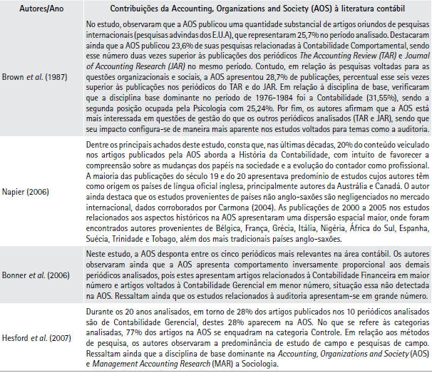 Napier (2006) realizou uma revisão das publicações científicas veiculadas na Accounting, Organizations and Society (AOS) de cunho histórico no período de 1976 a 2005. Objetivava identificar a contribuição desse periódico para a história da Contabilidade e, a partir dessa análise, traçar algumas das possíveis direções em que esta pode se desenvolver no futuro. O autor constatou, em seus achados, que muitas dessas publicações de cunho histórico influenciaram significativamente a literatura contábil.