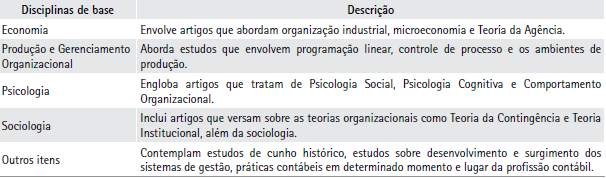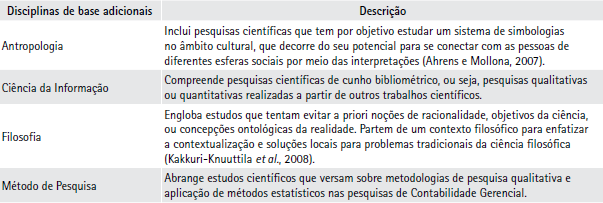 No que concerne às disciplinas de base dos artigos pesquisados, observou-se que a disciplina que se sobressaiu foi a Sociologia, seguida das disciplinas de Economia, Produção e Gerenciamento e de Psicologia. O destaque para a disciplina de Sociologia pode estar indicando uma quebra de paradigma nas pesquisas de Contabilidade Gerencial, isto é, uma substituição da tradicional visão econômica pela social, embora aquela ainda tenha embasado vários dos estudos publicados no periódico em análise. Também foi constatado que há inserção de novas disciplinas de base nas pesquisas relacionadas à Contabilidade Gerencial em relação ao estudo de Hesford et al. (2007), tendo como origem informações da Ciência da Informação, de Métodos de Pesquisa, de Antropologia e de Filosofia.